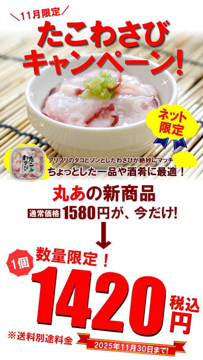- 11月キャンペーン、『たこわさび180g入』特価販売中!